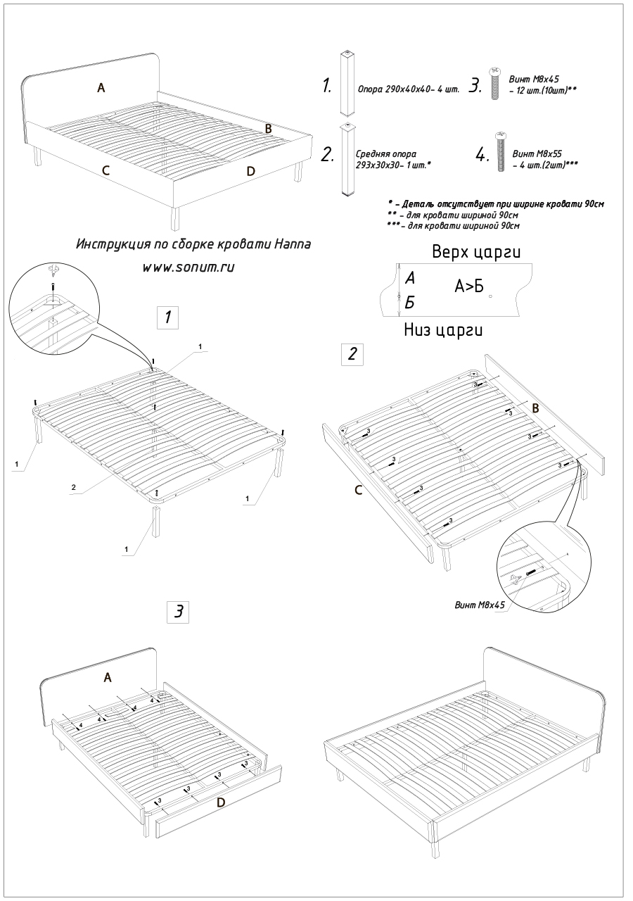 Спинка у изголовья и изножье. Эти предметы не являются обязательными и служат скорее для украшения и для повышения комфорта. Например, при чтении книги перед сном намного удобнее опираться на высокую мягкую спинку. А край эстетичных ножек зрительно отделяет спальное пространство от всей спальни и являются акцентом, от которого ваш интерьер только выиграет.
